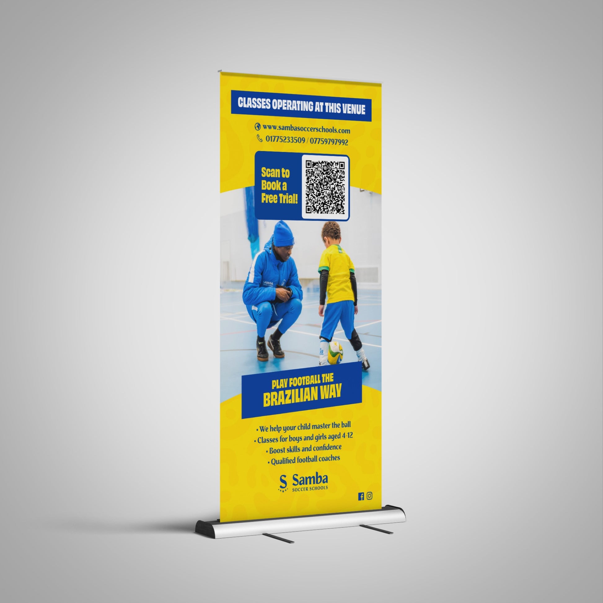 A stand-up retractable banner with Samba branding. Perfect for attracting new families and promoting your classes.